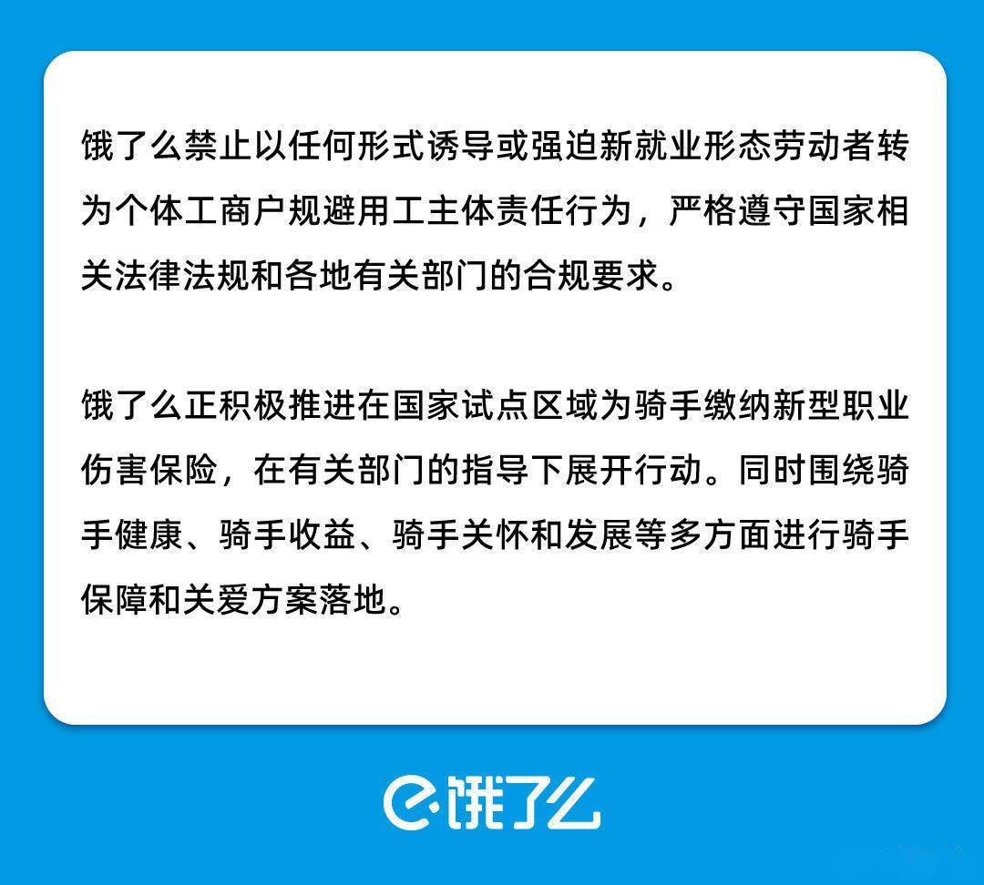 9 月 15 日消息 饿了么今日午间发布公告,饿了么禁止以任何形式诱导或强迫新就业形态劳动者转为个体工商户规避用工主体责任行为,严格遵守国家相关法律法规和各地有关部门的合规要求。